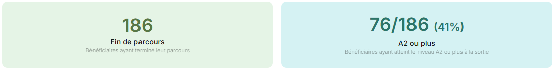 À l’issue du parcours, les participants sont capables de comprendre et utiliser des expressions courantes, de communiquer dans des situations simples, de réaliser des démarches administratives de base et d’interagir dans leur environnement social et professionnel. La formation vise également à favoriser l’accès à l’emploi ou à un parcours de formation.